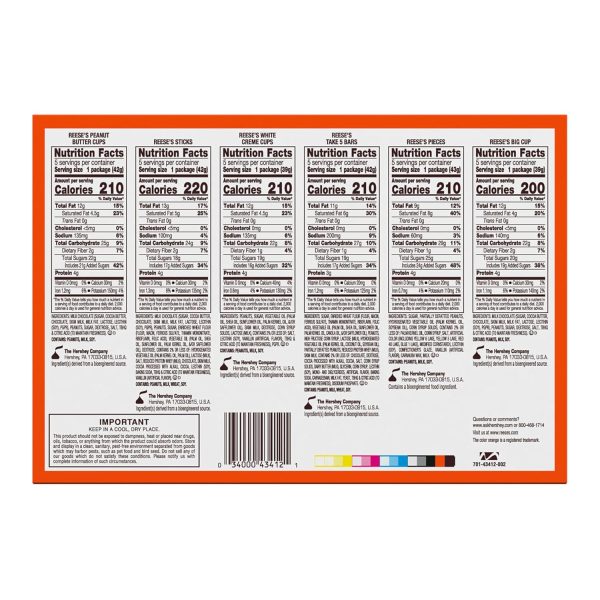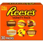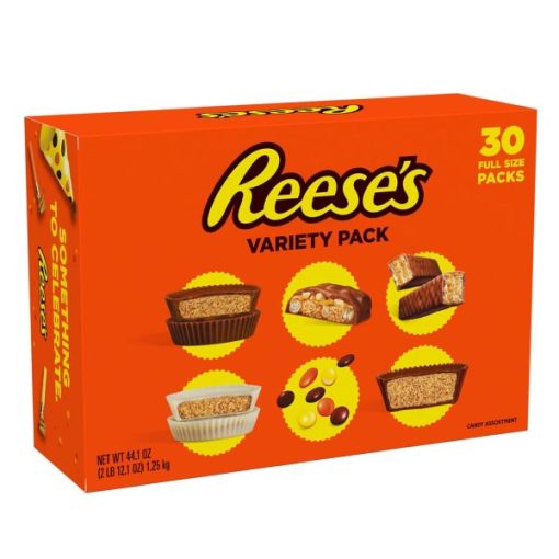 30-count bulk variety pack of REESE’S Assorted Peanut Butter Candy Make life sweeter with REESE’S peanut butter bulk candy assortment during parties, games nights and movie marathons Includes 30 individually wrapped, kosher certified assorted REESE’S candies inside a bulk candy gift box for easy gifting to family, friends and co-workers Divvy out this REESE’S candy variety pack to stock fundraisers, concession stands and vending machines or fill birthday gift bags and school lunch boxes Bite into REESE’S milk chocolate, white creme and peanut butter treats during your Christmas, Easter, Valentine’s Day andHalloween candy celebrations